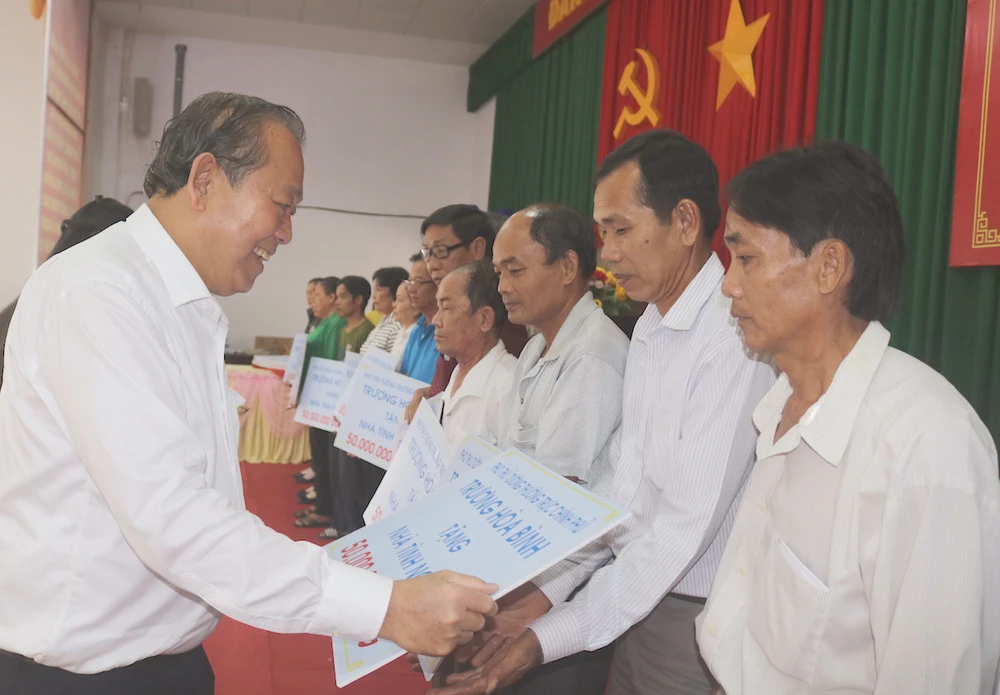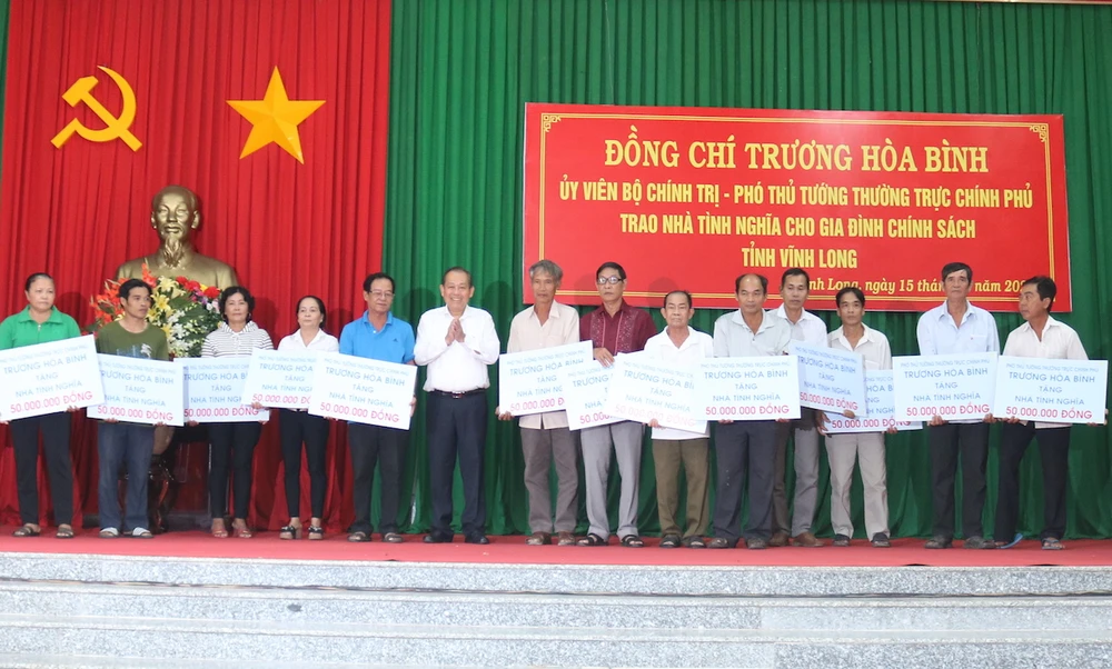 Phó Thủ tướng thường trực Chính phủ Trương Hòa Bình trao tặng 30 căn nhà cho gia đình chính sách ở tỉnh Vĩnh Long. Ảnh: Hải Dương