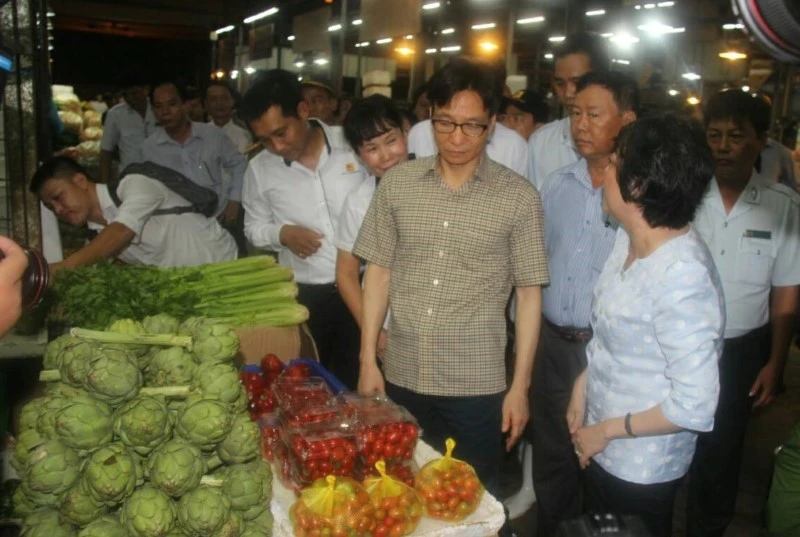 Thực hiện chương trình công tác của Ban chỉ đạo trung ương về vệ sinh an toàn thực phẩm, rạng sáng 6-5, Phó Thủ tướng Vũ Đức Đam cùng đoàn công tác của Bộ Công Thương, Bộ Nông nghiệp và Phát triển nông thôn, Bộ Y tế đã thị sát tình hình kinh doanh buôn bán của bà con tiểu thương và công tác đảm bảo an toàn thực phẩm ở chợ đầu mối Bình Điền (quận 8, TP.HCM).