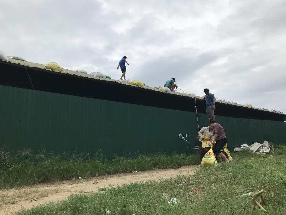 Người dân xã Nghĩa An (TP Quảng Ngãi) dùng cát bỏ lên mái nhà để chống bão. Ảnh: HẢI HIẾU
