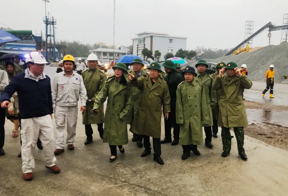 Phó thủ tướng Trịnh Đình Dũng (hàng trên, thứ 3 từ phải) chỉ đạo công tác phòng chóng bão tại Khu kinh tế Dung Quốc (Quảng Ngãi). Ảnh: HẢI HIẾU