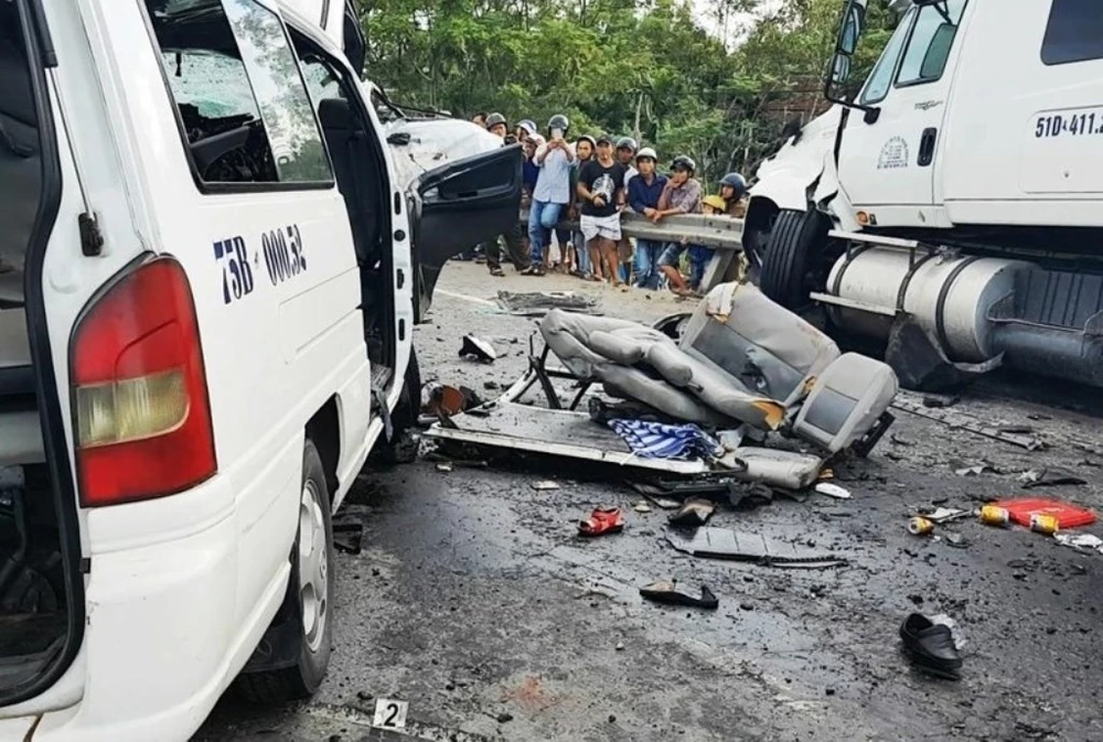 Xe khách 16 chỗ 75B-000.52 chở 17 người trong đoàn rước dâu từ Quảng Trị, di chuyển vào phía Nam đã va chạm với xe container 51D-411.21 kéo theo rơmoóc 51R-215.75.
