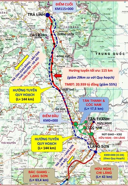 Tuy nhiên, sau khi khảo sát, tỉnh Cao Bằng có đề xuất phương án nghiên cứu đầu tư dự án trên với chiều dài 115 km (giảm 29km so với quy hoạch) và rút ngắn vốn đầu tư xuống gần 21.000 tỉ đồng (910 triệu USD), giảm gần 26.600 tỉ đồng so với tổng mức ban đầu (hơn 1,1 tỉ USD).