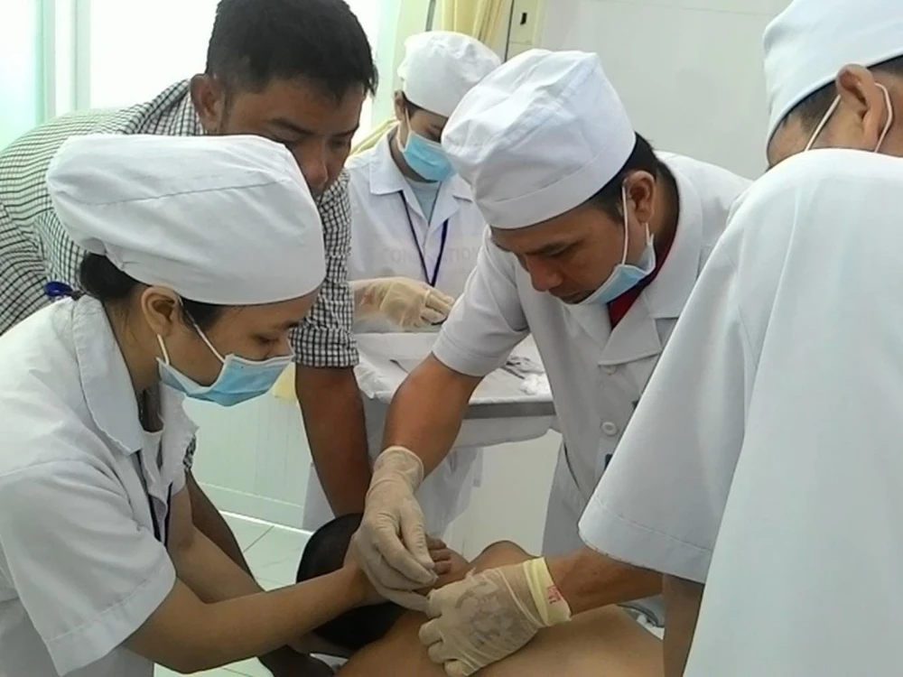 Các bác sĩ Viện Y dược học dân tộc thăm khám cho một em bé bị bệnh tự kỷ. Ảnh: HỒNG MINH