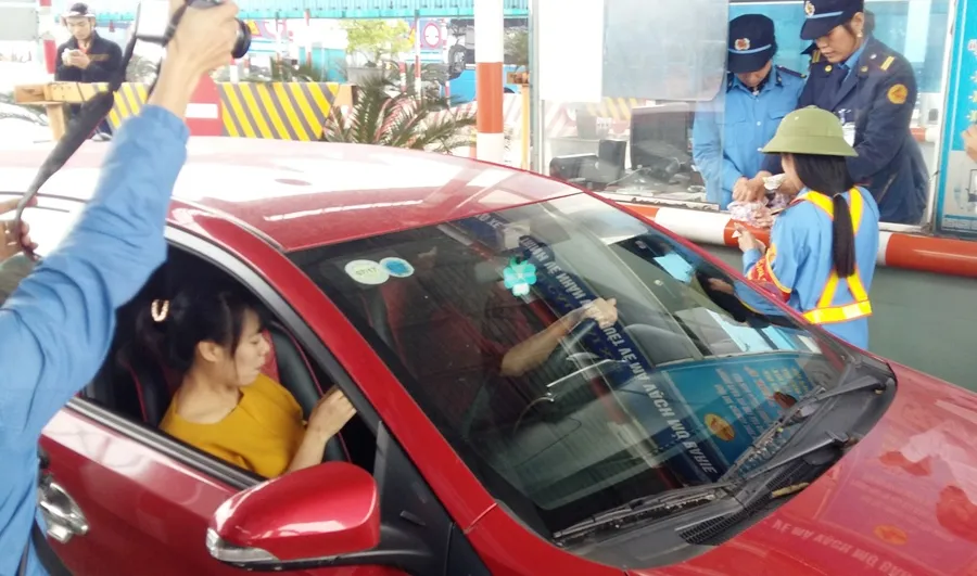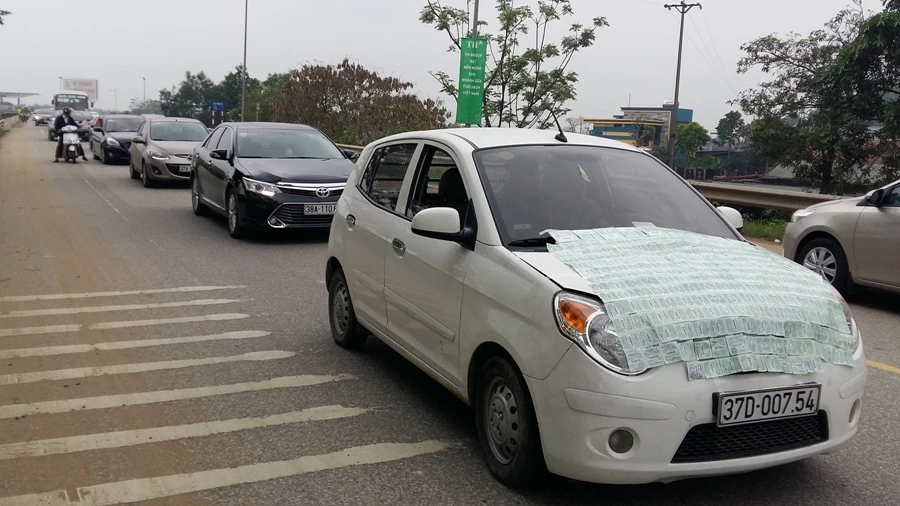 Người dân dùng vé BOT Bến Thủy dán kín đầu xe đi diễu hành trên đường sáng 2-4.