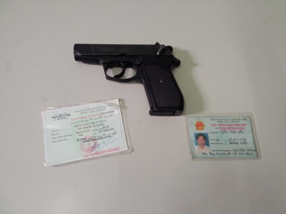 Tại công an phường, ông Hòa xuất trình được giấy phép sử dụng súng công cụ hỗ trợ do công an tỉnh An Giang cấp cho một Chi nhánh NH TM-CP Việt Á tại tỉnh này sử dụng, một biên bản bàn giao súng giữa Chi nhánh NH trên và ông Hòa.