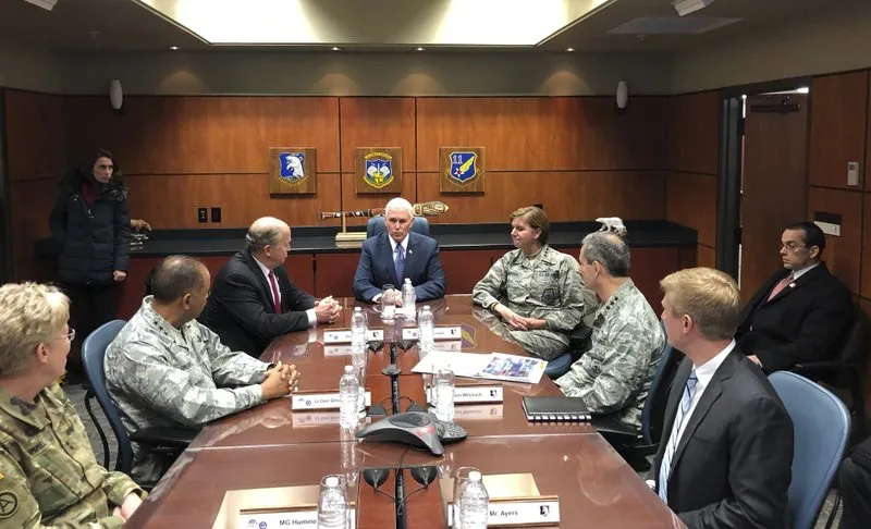 Ông Pence họp báo với Bộ tư lệnh quân sự của vùng Bắc Mỹ tại căn cứ Elmendorf-Richardson ở Anchorage, Alaska trước khi rời Washington hôm 5-2. Ảnh: AP