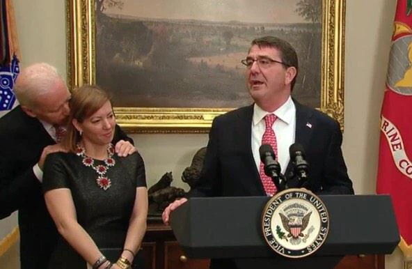 Những hình ảnh được ghi lại tại buổi tuyên thệ nhậm chức của ông Ashton Carter cho thấy, trong lúc ông đang thực hiện bài phát biểu của mình, Phó Tổng thống Biden đã tiến đến đằng sau bà Stephanie, vợ ông Carter.