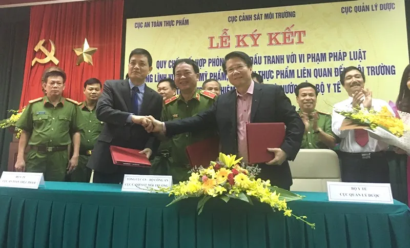 Đại diện Cục Cảnh sát Môi trường, Cục Quản lý Dược và Cục ATTP ký kết Qui chế phối hợp.