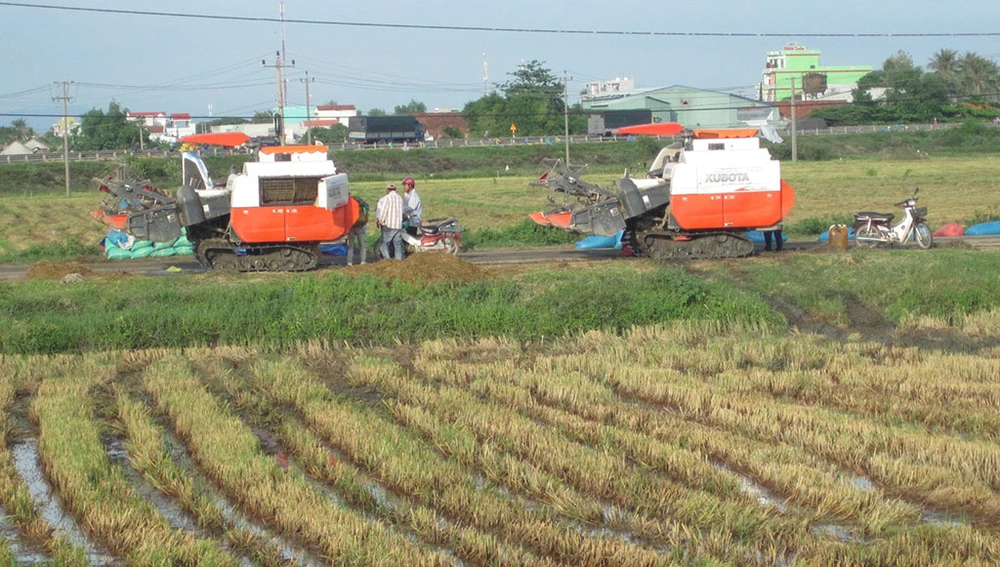 Những chiếc máy gặt lúa liên hợp làm việc hết công suất, liền sau đó là những chiếc xe công nông chở thóc tranh thủ phơi ngay trên đường quốc lộ. Thậm chí ban đêm họ mắc cả võng lên lan can lề đường để bảo vệ thóc…