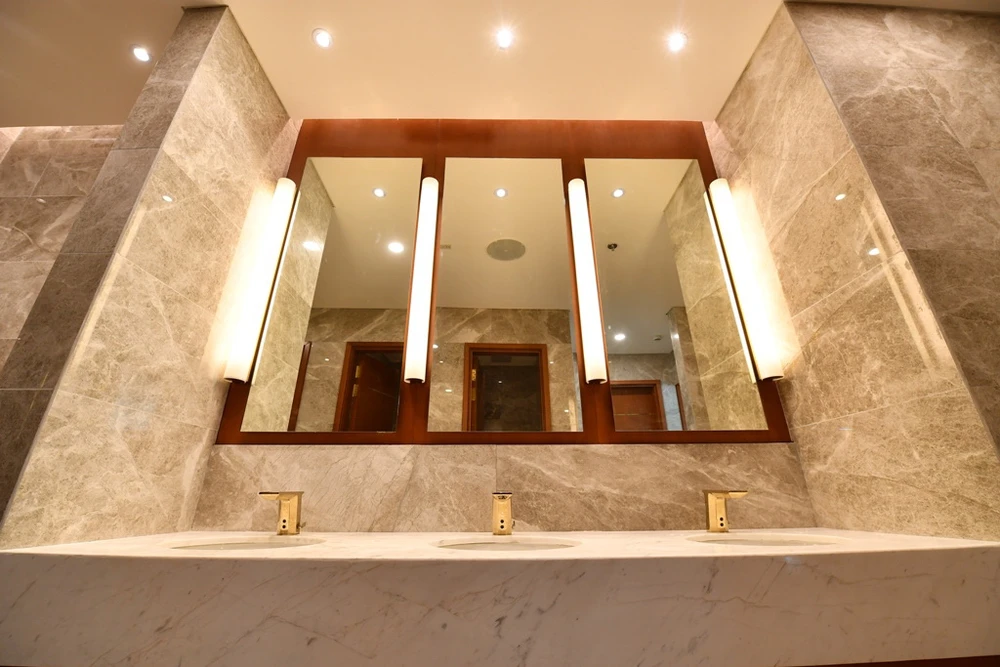 Phòng tắm và khu vực vệ sinh riêng biệt, được ốp đá tự nhiên sang trọng, vòi nước mạ vàng đẳng cấp. Đây có lẽ là điểm khác biệt lớn nhất của phòng chờ hạng thương gia Cảng hàng không quốc tế Vân Đồn so với nhiều sân bay khác.
