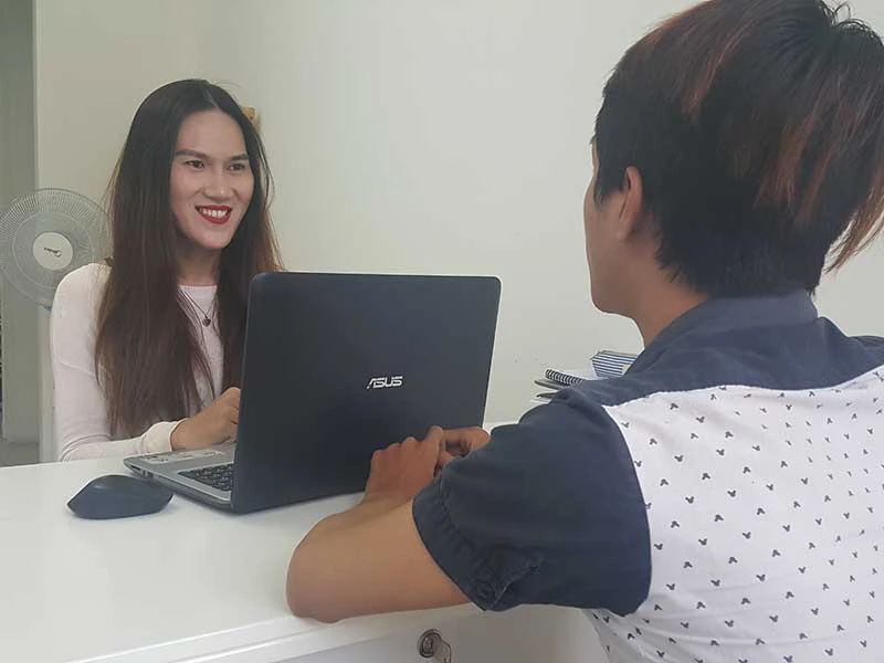 Chị Mia Nguyễn tư vấn cho một bạn trẻ. Ảnh: HM