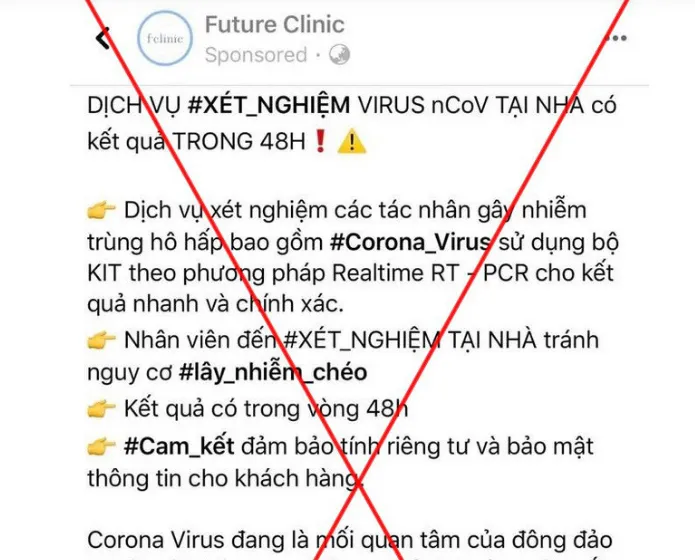 Trước đó, ngày 8-2, tài khoản Facebook Future Clinic đăng tải thông tin “Dịch vụ xét nghiệm virus Corona (nCoV) tại nhà, có kết quả trong 48 giờ”.