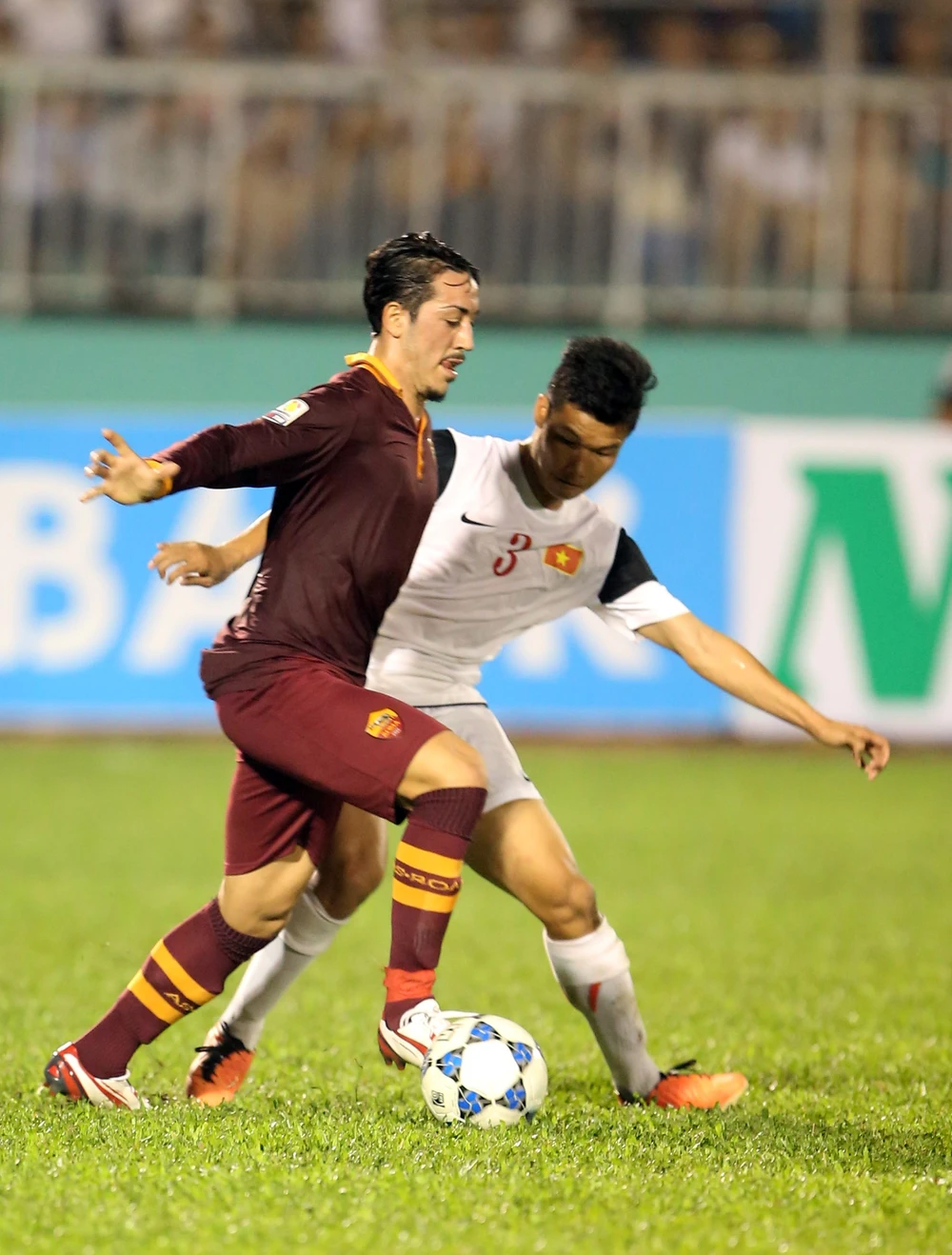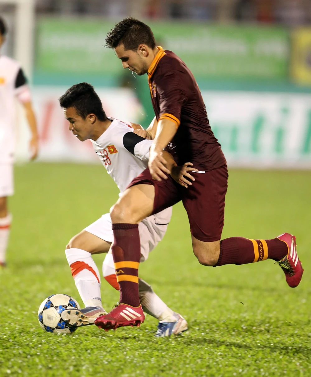 Thể hình mỏng cơm hơn cầu thủ Roma nhưng Thanh Tùng vẫn xoay trở hết sức khéo léo. ẢNh: XUÂN HUY.