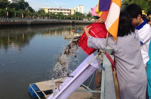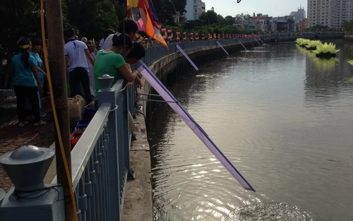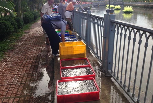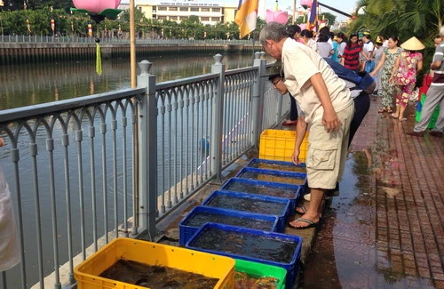 Người dân tìm đến thả cá bên bờ kênh Nhiêu Lộc rất đông