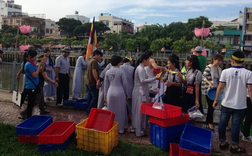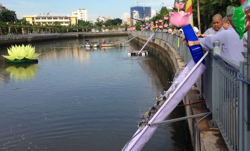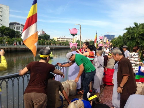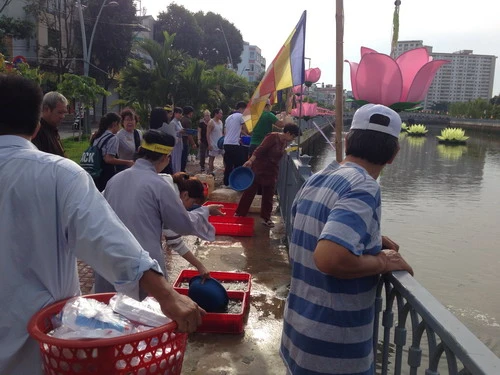 Đông đảo Phật tử, tăng ni cùng người dân có mặt tại bờ kè kênh Nhiêu Lộc – Thị Nghè để thả cá phóng sanh