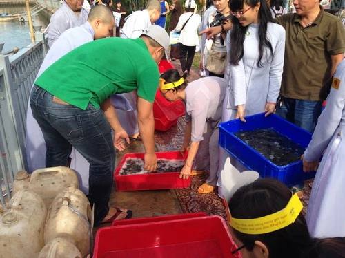 Từ người lớn đến trẻ em, ai cũng thành tâm thả cá phóng sanh để mong điều tốt lành