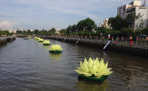 Rất nhiều đèn hoa sen được thả trên mặt kênh