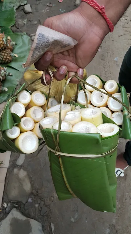 Những mụt măng rừng được gói trong chiếc giỏ gấp bằng lá chuối vừa đẹp, vừa bảo vệ môi trường.