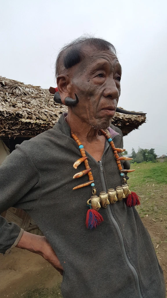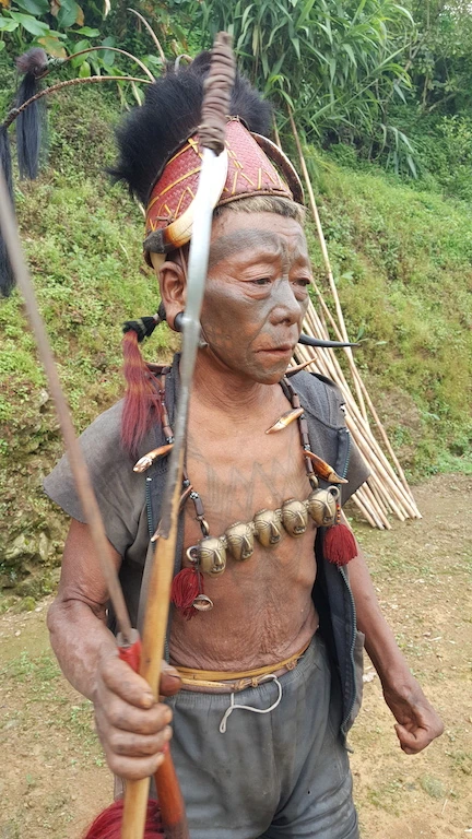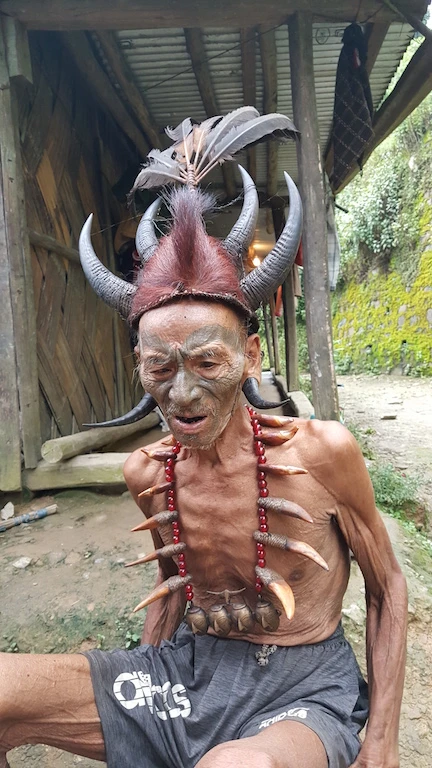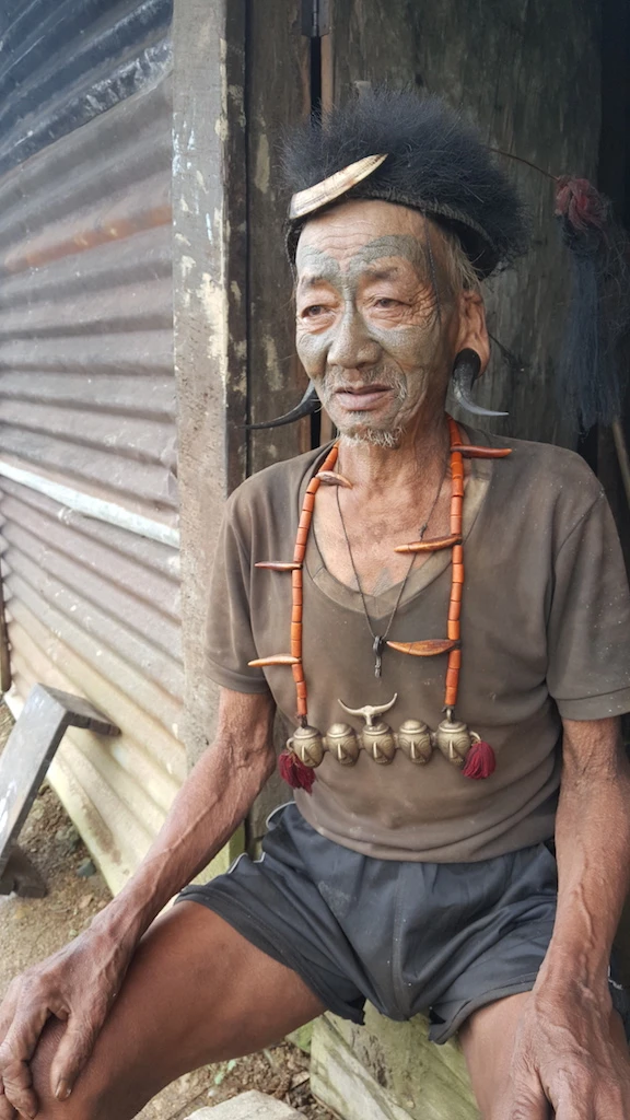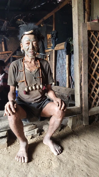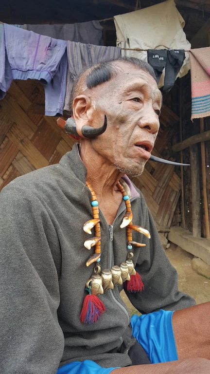 Ông cụ này là một chiến binh săn đầu người ngày xưa. Nay ông đã 84 tuổi, bắt đầu được xăm mặt khi 22 tuổi sau khi lấy được đầu một kẻ thù - một phong tục của người Konyak.