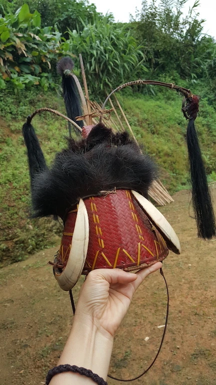 Chiếc mũ của những thợ săn đầu người tự làm kết từ lông gấu, sừng hươu nai săn bắn được.