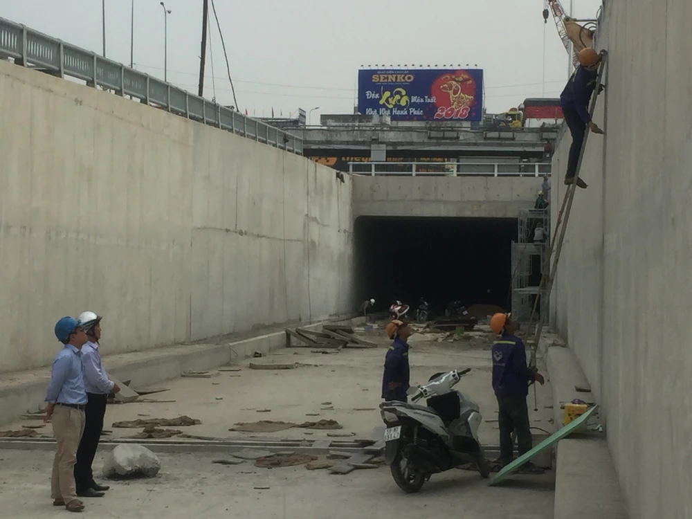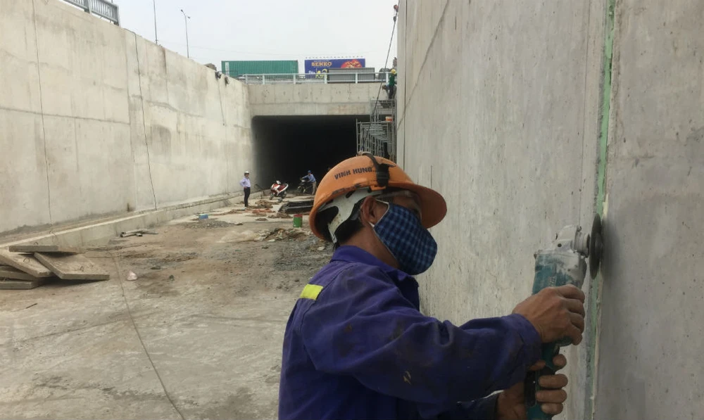 Công nhân đang hoàn thiện vách hầm chui An Sương.
