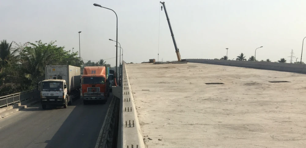 Mặt cầu vượt thẳng từ hai hướng cầu Phú Mỹ đổ vào và từ hướng đường cao tốc lao sang cũng đã được làm xong.