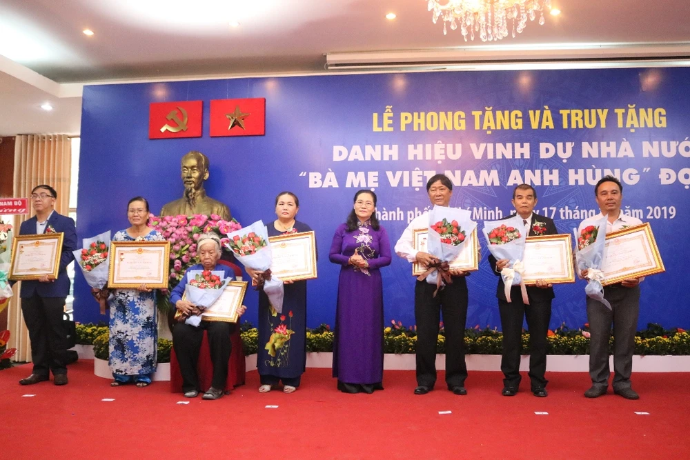 Chiều nay (17-10), tại Bảo tàng Phụ nữ Nam bộ (TP.HCM), Thành ủy, HĐND, UBND, Ủy ban MTTQ Việt Nam TP.HCM đã tổ chức lễ phong tặng, truy tặng danh hiệu Bà mẹ Việt Nam anh hùng (VNAH) đến 15 mẹ đã có chồng, con hy sinh vì sự nghiệp giải phóng dân tộc, bảo vệ Tổ quốc.