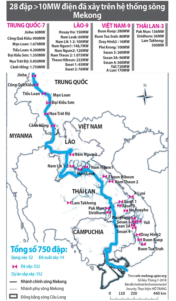 Thượng nguồn sông Mekong dự kiến có 467 thủy điện, trong đó khoảng 1/4 đang trong quá trình xây dựng hoặc dự kiến xây dựng. Riêng trên dòng chính Mekong, Trung Quốc, Lào và Campuchia đã quy hoạch hơn 20 đập thủy điện. Trong đó, Trung Quốc đã xây tám đập ở thượng nguồn; Lào và Campuchia có kế hoạch xây 11 đập ở hạ nguồn. Ảnh: internationalrivers.org