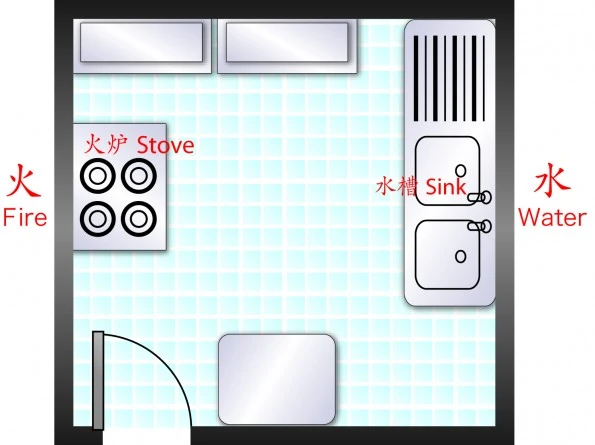 Bếp (Hỏa) và máng nước (Thủy) gần nhau sẽ khiến vận thế của gia đình tụt dốc, dễ gây ra thị phi, hao tài tốn của, chiêu gọi tiểu nhân. Do đó bếp và máng nước tốt nhất nên tách riêng.