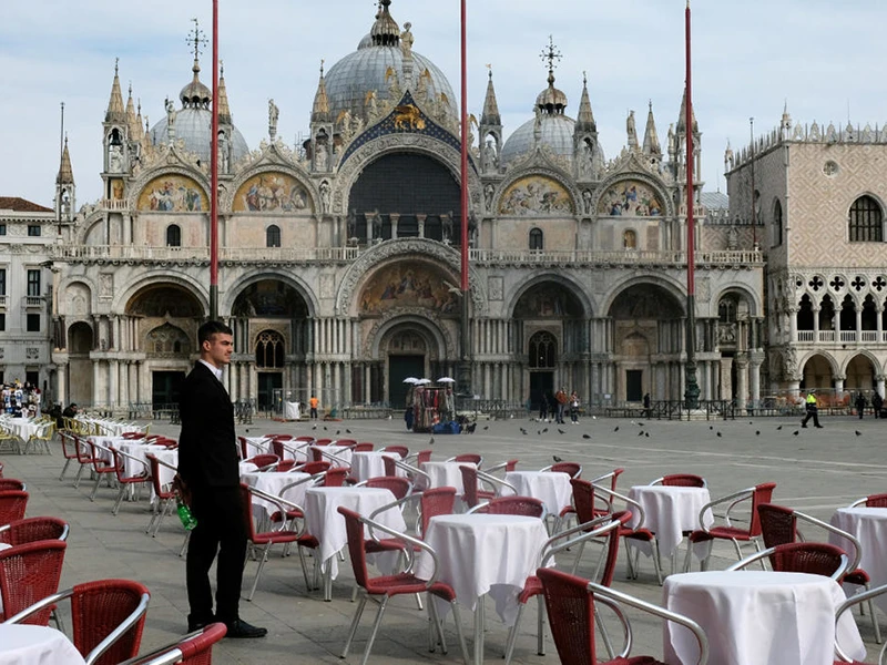 Hàng quán tại quảng trường San Marco, TP Venezia (Ý) trở nên vắng vẻ sau khi chính phủ công bố phong tỏa nước Ý hôm 9-3. Ảnh: REUTERS