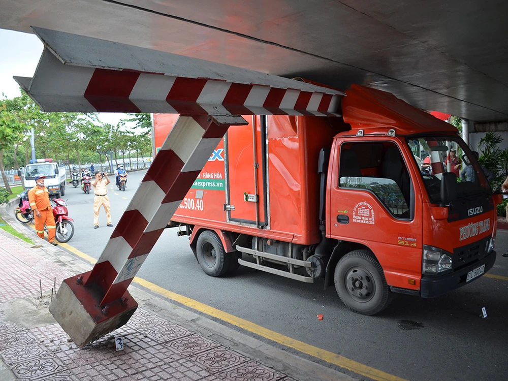 Khi đến cầu Hoàng Hoa Thám (phường 3, quận Bình Thạnh, TP.HCM) phần thùng xe đã va chạm với thanh giới hạn chiều cao.