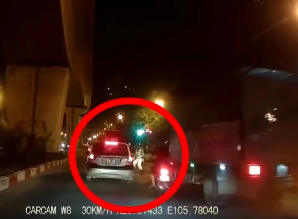 Thời điểm trên, một nam thanh niên không đội mũ bảo hiểm, phát hiện có chốt làm nhiệm vụ của tổ công tác đặc biệt 141 bên đường đã rồ ga phóng nhanh, len vào giữa hai ô tô đang dừng chờ đèn đỏ nhằm bỏ chạy.