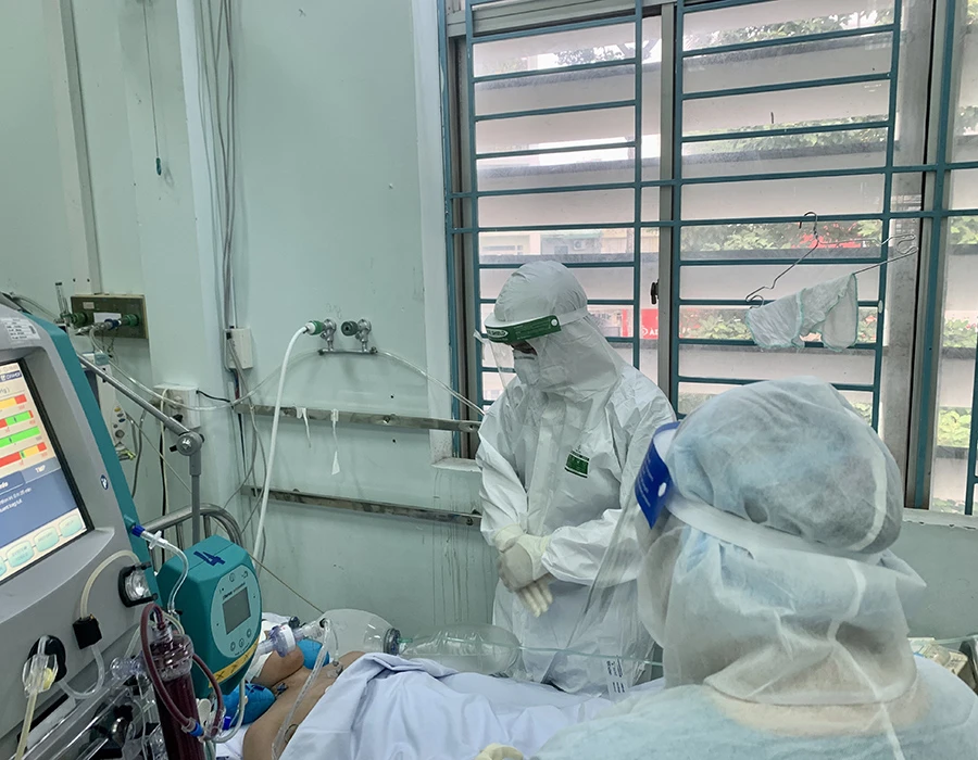 Bé N đang được điều trị tích cực biến chứng đái tháo đường và bệnh cảnh COVID-19 tại Khoa COVID-19 BV Nhi đồng 1. Ảnh: HL