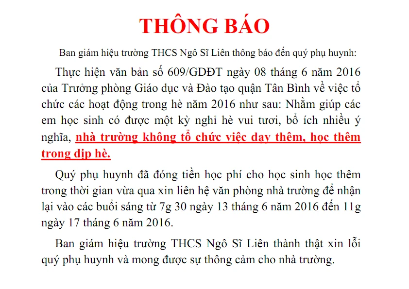 Thông báo của trường THCS Ngô Sĩ Liên gửi đến phụ huynh ngày 9-6.