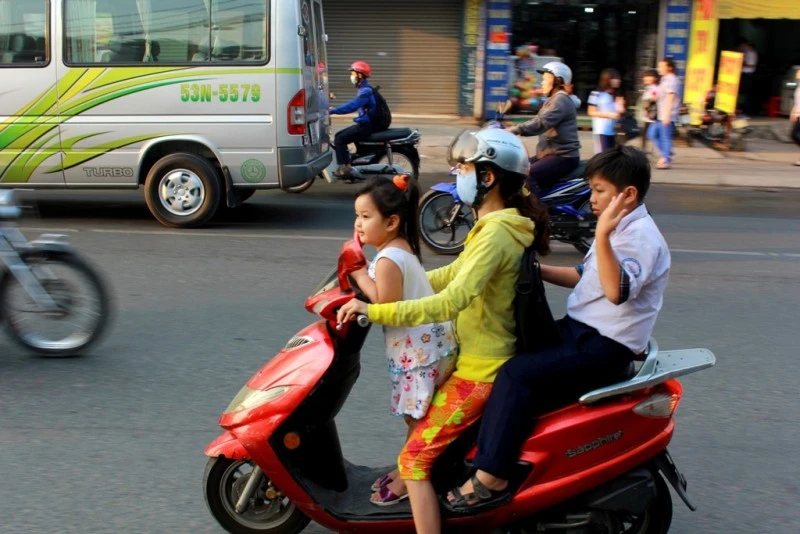 Phụ huynh đi xe máy thường xuyên không đội mũ bảo hiểm cho con - Ảnh Phước Tĩnh