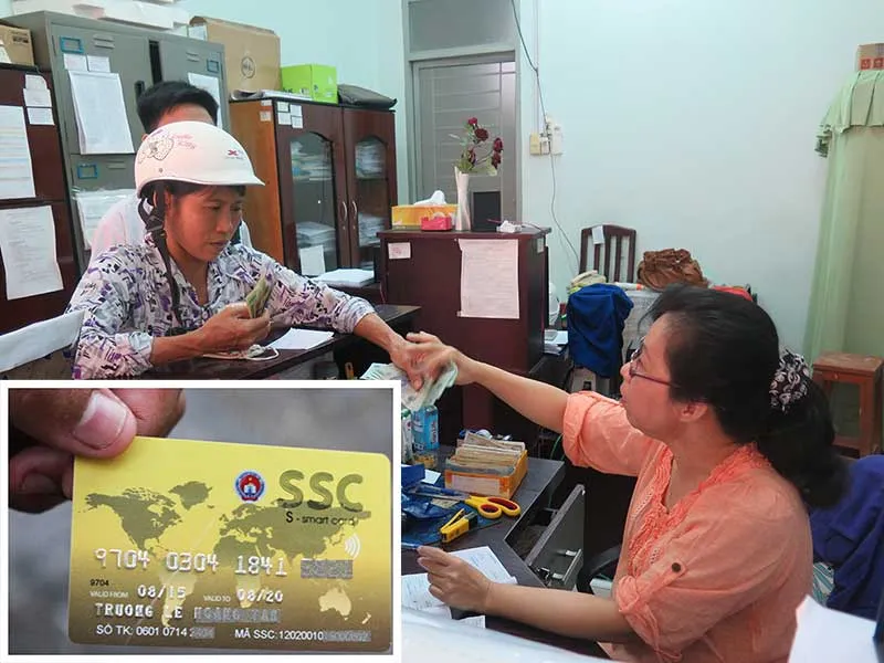 Phụ huynh đóng tiền học cho con tại Trường THPT Ngô Quyền, quận 7 bằng… tiền mặt. Ảnh: PA. Ảnh nhỏ: Thẻ SSC