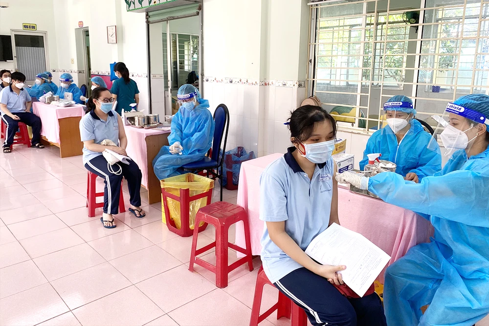 Trường Mầm non Anh Đào, quận Gò Vấp được trưng dụng làm điểm tiêm vaccine cho học sinh từ 12 đến 17 tuổi. Ảnh: NTCC