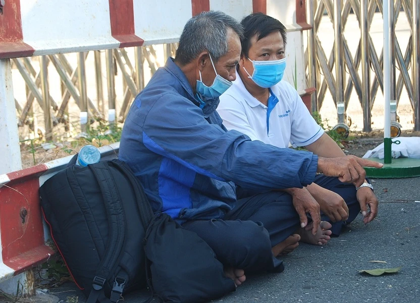 Ông Thiên (bên trái) ngồi chờ con làm bài thi đánh giá năng lực