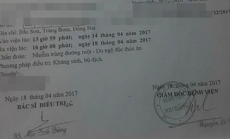 Đến sáng hôm sau, con sốt cao, chị L. đưa đến BV Nhi đồng Đồng Nai cấp cứu rồi nhập viện luôn. Khi vào nhập viện thì gặp rất nhiều phụ huynh có con học cùng trường cũng đang cấp cứu tại đây. H. được các bác sĩ chẩn đoán nhiễm trùng đường ruột do ngộ độc thức ăn.