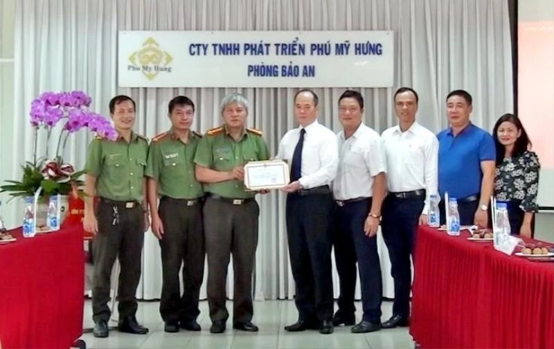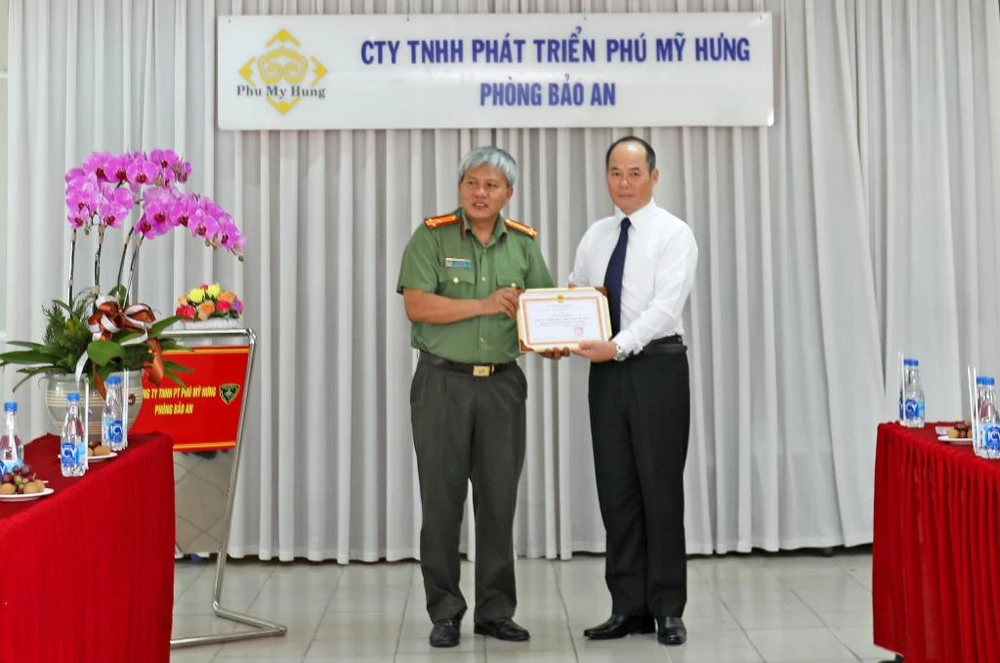 Đại diện Công ty Phú Mỹ Hưng nhận bằng khen từ Thượng tá Lê Văn Lâm - Phó Trưởng Công an Quận 7