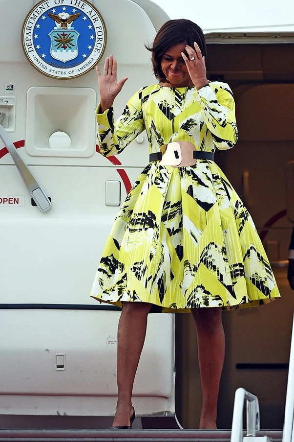 Michelle Obama trong chiếc váy nhiều màu khác của Roksanda khi lên máy bay trở về Mỹ hôm 22-3.