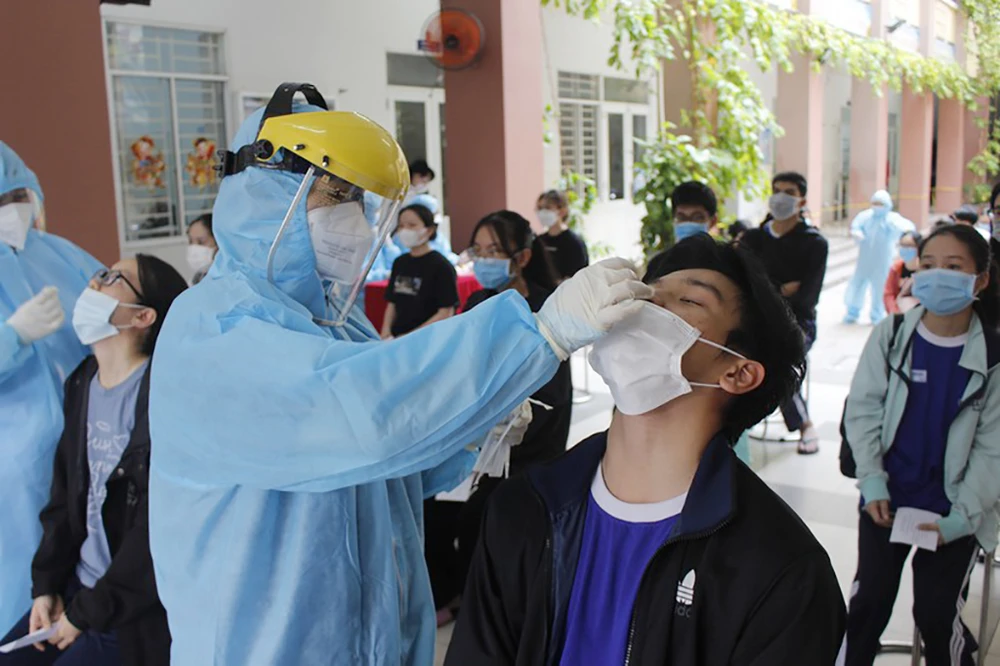 Lấy mẫu xét nghiệm nghiệm test nhanh kháng nguyên hoặc PCR 3 ngày/ lần, ít nhất 3 lần trong trường hợp phát hiện F0 tại nơi làm việc, công ty, trường học. Ảnh: NGUYỄN YÊN