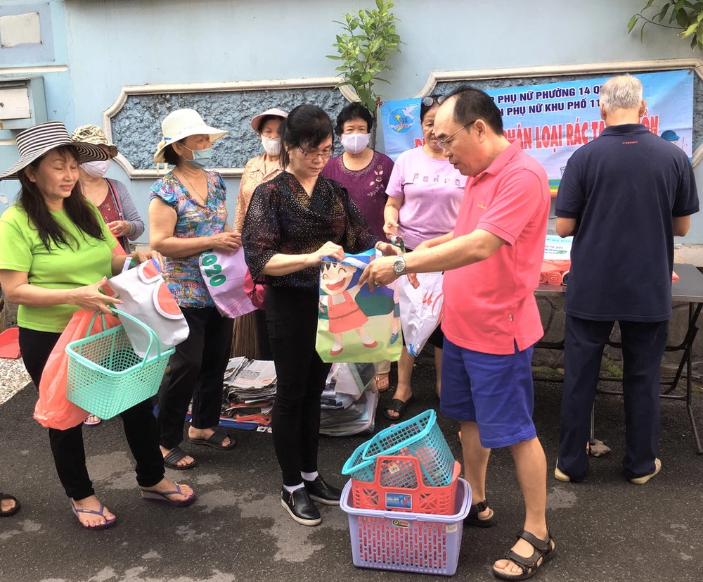 Người dân tham gia chương trình đổi chai nhựa, đồ nhựa cũ lấy túi rác tự hủy, giỏ đi chợ tại phường 14, quận 10. Ảnh: TT