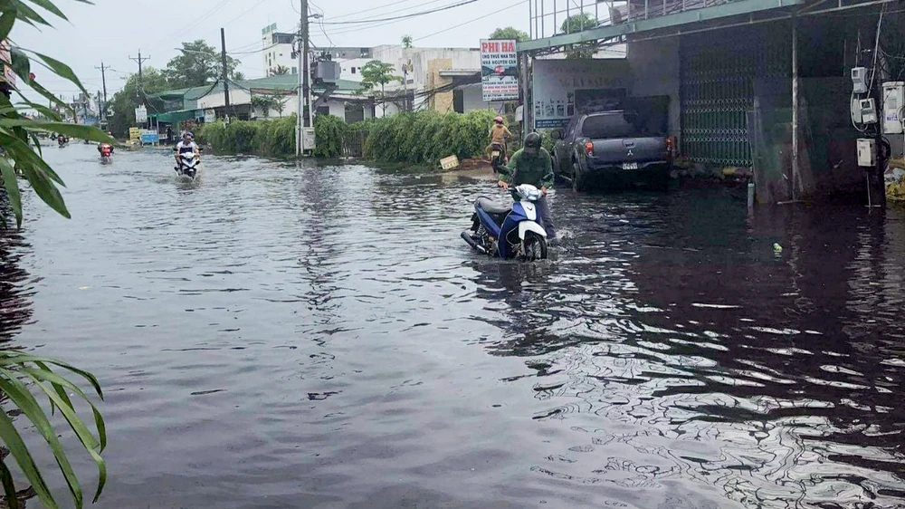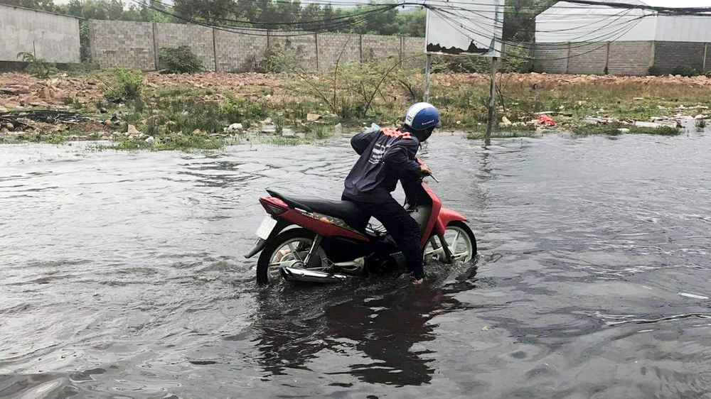 Mưa trái mùa làm ngập đường, người dân đi lại khó khăn trong sáng 7-4. Ảnh: TH