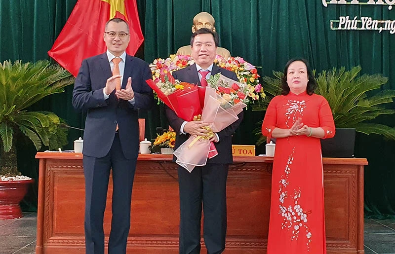 Lãnh đạo Tỉnh ủy HĐND tỉnh Phú Yên tặng hoa chúc mừng ông Trần Hữu Thế (giữa). Ảnh: TẤN LỘC