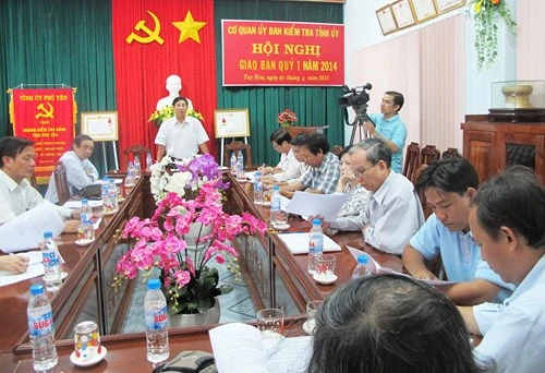 Ông Lê Minh (đứng), Phó Chủ nhiệm Ủy ban Kiểm tra Tỉnh ủy Phú Yên công bố việc kỷ luật một số cán bộ lãnh đạo chiều 17-4. Ảnh: TẤN LỘC