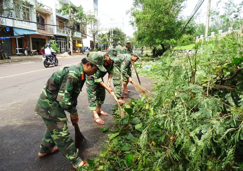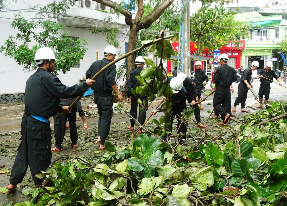 Các lực lượng vũ trang, xung kích tham gia dọn cây xanh bị ngã đổ tại TP Tuy Hòa