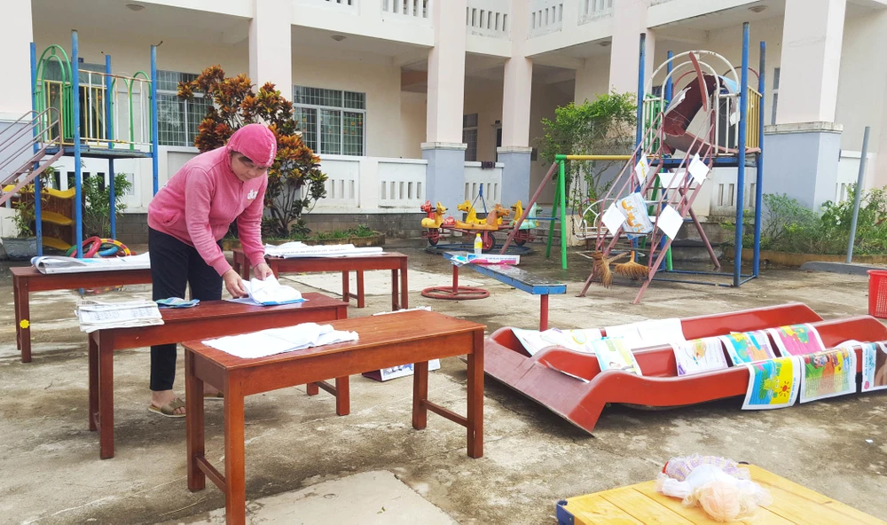 Cô giáo Nguyễn Thị Minh Huy, Trường Mầm non Hòa Xuân Nam (huyện Đông Hòa, Phú Yên) phơi dụng cụ học tập của trường bị mưa bão làm ướt, hư hỏng. Ảnh: TẤN LỘC