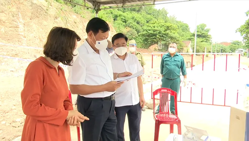 Thứ trưởng Bộ Y tế Đỗ Xuân Tuyên (thứ hai từ trái sang) kiểm tra chốt phong tỏa khu vực có người mắc COVID-19 ở TP Tuy Hòa. Ảnh: VŨ XUÂN