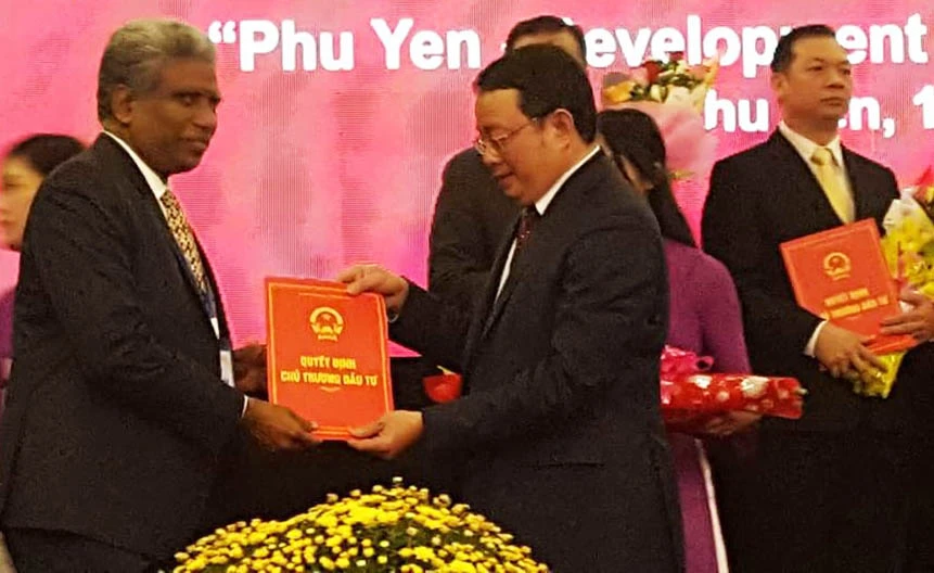 Ông Hoàng Văn Trà, Chủ tịch UBND tỉnh Phú Yên trao quyết định chủ trương đầu tư cho nhà đầu tư nước ngoài triển khai dự án tại Phú Yên. Ảnh: TẤN LỘC
